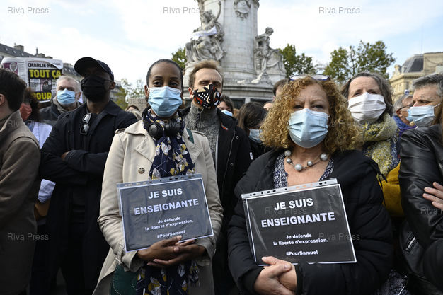 Légende : Rassemblement Place de la République en hommage à Samuel Paty, professeur d'histoire d'un collège de Conflans Saint-Honorine, en région parisienne, décapité vendredi par un terroriste russe tchétchène pour avoir montré à ses élèves les caricatures de Mahomet publiées par Charlie Hebdo. "Je suis enseignante. Je défends la liberté d'expression" /// Rally Place de la République in tribute to Samuel Paty, professor of history at a college in Conflans Saint-Honorine, in the Paris region, beheaded on Friday by a Chechen Russian terrorist for showing his students the caricatures of Muhammad published by Charlie Hebdo. "I am a teacher. I defend freedom of expression" - Paris - 18/10/2020 - Photo © Lionel Préau +33 (0)6 68 12 83 77