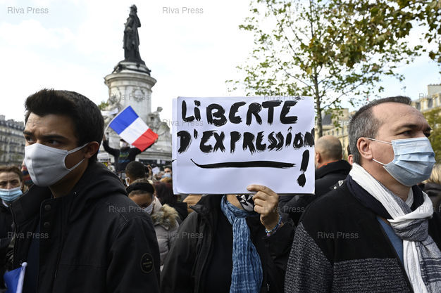 Légende : Rassemblement Place de la République en hommage à Samuel Paty, professeur d'histoire d'un collège de Conflans Saint-Honorine, en région parisienne, décapité vendredi par un terroriste russe tchétchène pour avoir montré à ses élèves les caricatures de Mahomet publiées par Charlie Hebdo. "Liberté d'expression !" /// Rally Place de la République in tribute to Samuel Paty, professor of history at a college in Conflans Saint-Honorine, in the Paris region, beheaded on Friday by a Chechen Russian terrorist for showing his students the caricatures of Muhammad published by Charlie Hebdo. "Freedom of expression !" - Paris - 18/10/2020 - Photo © Lionel Préau +33 (0)6 68 12 83 77