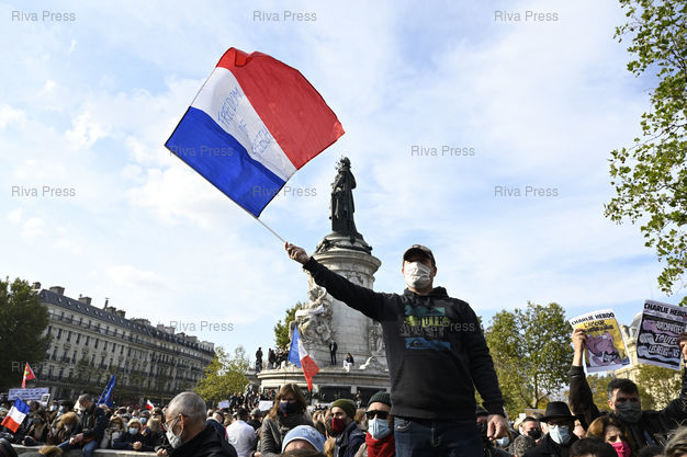 Légende : Rassemblement Place de la République en hommage à Samuel Paty, professeur d'histoire d'un collège de Conflans Saint-Honorine, en région parisienne, décapité vendredi par un terroriste russe tchétchène pour avoir montré à ses élèves les caricatures de Mahomet publiées par Charlie Hebdo. Un manifestant porte un drapeau français avec l'inscription "freedom of speech" /// Rally Place de la République in tribute to Samuel Paty, professor of history at a college in Conflans Saint-Honorine, in the Paris region, beheaded on Friday by a Chechen Russian terrorist for showing his students the caricatures of Muhammad published by Charlie Hebdo. A protester carries a French flag with the inscription" freedom of speech " - Paris - 18/10/2020 - Photo © Lionel Préau +33 (0)6 68 12 83 77