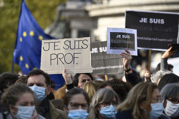 Légende : Rassemblement Place de la République en hommage à Samuel Paty, professeur d'histoire d'un collège de Conflans Saint-Honorine, en région parisienne, décapité vendredi par un terroriste russe tchétchène pour avoir montré à ses élèves les caricatures de Mahomet publiées par Charlie Hebdo. "Je suis prof" /// Rally Place de la République in tribute to Samuel Paty, professor of history at a college in Conflans Saint-Honorine, in the Paris region, beheaded on Friday by a Chechen Russian terrorist for showing his students the caricatures of Muhammad published by Charlie Hebdo. "I am a teacher" - Paris - 18/10/2020 - Photo © Lionel Préau +33 (0)6 68 12 83 77