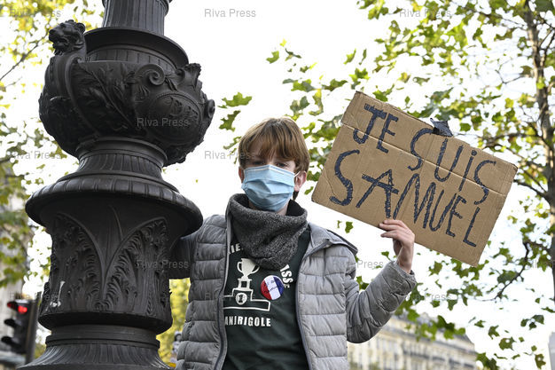 Légende : Rassemblement Place de la République en hommage à Samuel Paty, professeur d'histoire d'un collège de Conflans Saint-Honorine, en région parisienne, décapité vendredi par un terroriste russe tchétchène pour avoir montré à ses élèves les caricatures de Mahomet publiées par Charlie Hebdo. Un jeune manifestant porte une pancarte "Je suis Samuel" /// Rally Place de la République in tribute to Samuel Paty, professor of history at a college in Conflans Saint-Honorine, in the Paris region, beheaded on Friday by a Chechen Russian terrorist for showing his students the caricatures of Muhammad published by Charlie Hebdo. A young protester carries an "I am Samuel" sign - Paris - 18/10/2020 - Photo © Lionel Préau +33 (0)6 68 12 83 77