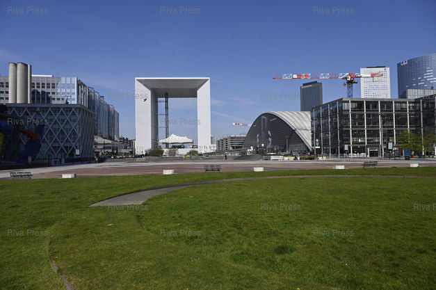 Légende : Ambiance sur le parvis de La Défense, plus grand quartier d'affaires d'Europe, pendant la période de confinement mise en place face à l'épidémie du Coronavirus Covid-19 /// Atmosphere on the forecourt of La Défense, the largest business district in Europe, during the containment period set up in the face of the Coronavirus Covid-19 epidemic - Paris La Défense - 08/04/2020 - Photo © Lionel Préau +33 (0)6 68 12 83 77