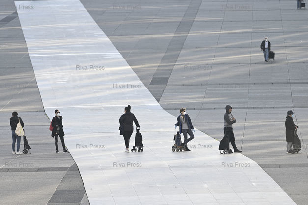 Légende : Ambiance sur le parvis de La Défense, plus grand quartier d'affaires d'Europe, pendant la période de confinement mise en place face à l'épidémie du Coronavirus Covid-19. Des habitants vont faire leurs courses à l'hypermarché Auchan du centre commercial Les 4 Temps, dont toutes les boutiques et restaurants sont fermés /// Atmosphere on the forecourt of La Défense, the largest business district in Europe, during the containment period set up in the face of the Coronavirus Covid-19 epidemic. Residents go shopping at the Auchan hypermarket in the Les 4 Temps shopping center, where all shops and restaurants are closed - Paris La Défense - 09/04/2020 - Photo © Lionel Préau +33 (0)6 68 12 83 77