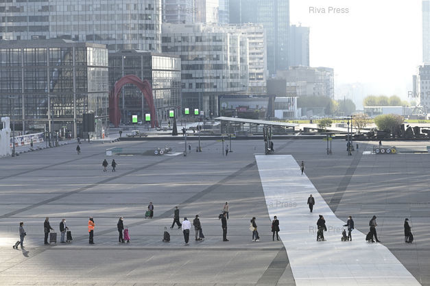 Légende : Ambiance sur le parvis de La Défense, plus grand quartier d'affaires d'Europe, pendant la période de confinement mise en place face à l'épidémie du Coronavirus Covid-19. Des habitants vont faire leurs courses à l'hypermarché Auchan du centre commercial Les 4 Temps, dont toutes les boutiques et restaurants sont fermés /// Atmosphere on the forecourt of La Défense, the largest business district in Europe, during the containment period set up in the face of the Coronavirus Covid-19 epidemic. Residents go shopping at the Auchan hypermarket in the Les 4 Temps shopping center, where all shops and restaurants are closed - Paris La Défense - 09/04/2020 - Photo © Lionel Préau +33 (0)6 68 12 83 77