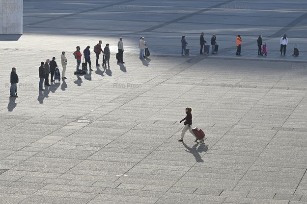Légende : Ambiance sur le parvis de La Défense, plus grand quartier d'affaires d'Europe, pendant la période de confinement mise en place face à l'épidémie du Coronavirus Covid-19. Des habitants vont faire leurs courses à l'hypermarché Auchan du centre commercial Les 4 Temps, dont toutes les boutiques et restaurants sont fermés /// Atmosphere on the forecourt of La Défense, the largest business district in Europe, during the containment period set up in the face of the Coronavirus Covid-19 epidemic. Residents go shopping at the Auchan hypermarket in the Les 4 Temps shopping center, where all shops and restaurants are closed - Paris La Défense - 09/04/2020 - Photo © Lionel Préau +33 (0)6 68 12 83 77