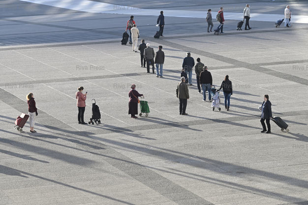 Légende : Ambiance sur le parvis de La Défense, plus grand quartier d'affaires d'Europe, pendant la période de confinement mise en place face à l'épidémie du Coronavirus Covid-19. Des habitants vont faire leurs courses à l'hypermarché Auchan du centre commercial Les 4 Temps, dont toutes les boutiques et restaurants sont fermés /// Atmosphere on the forecourt of La Défense, the largest business district in Europe, during the containment period set up in the face of the Coronavirus Covid-19 epidemic. Residents go shopping at the Auchan hypermarket in the Les 4 Temps shopping center, where all shops and restaurants are closed - Paris La Défense - 09/04/2020 - Photo © Lionel Préau +33 (0)6 68 12 83 77