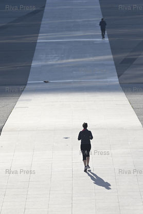 Légende : Ambiance sur le parvis de La Défense, plus grand quartier d'affaires d'Europe, pendant la période de confinement mise en place face à l'épidémie du Coronavirus Covid-19. Des habitants font un footing, autorisé avant 10h /// Atmosphere on the forecourt of La Défense, the largest business district in Europe, during the containment period set up in the face of the Coronavirus Covid-19 epidemic. Resident jogging, authorized before 10 a.m. - Paris La Défense - 09/04/2020 - Photo © Lionel Préau +33 (0)6 68 12 83 77
