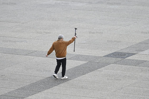 Légende : Ambiance sur le parvis de La Défense, plus grand quartier d'affaires d'Europe, pendant la période de confinement mise en place face à l'épidémie du Coronavirus Covid-19. Un homme âgé portant un masque de protection et une canne fait des mouvements de gymnastique, comme autorisé avant 10h /// Atmosphere on the forecourt of La Défense, the largest business district in Europe, during the containment period set up in the face of the Coronavirus Covid-19 epidemic. An elderly man wearing protective mask and cane, performs gymnastic movements, as authorized before 10 a.m. - Paris La Défense - 11/04/2020 - Photo © Lionel Préau +33 (0)6 68 12 83 77