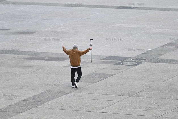 Légende : Ambiance sur le parvis de La Défense, plus grand quartier d'affaires d'Europe, pendant la période de confinement mise en place face à l'épidémie du Coronavirus Covid-19. Un homme âgé portant un masque de protection et une canne fait des mouvements de gymnastique, comme autorisé avant 10h /// Atmosphere on the forecourt of La Défense, the largest business district in Europe, during the containment period set up in the face of the Coronavirus Covid-19 epidemic. An elderly man wearing protective mask and cane, performs gymnastic movements, as authorized before 10 a.m. - Paris La Défense - 11/04/2020 - Photo © Lionel Préau +33 (0)6 68 12 83 77