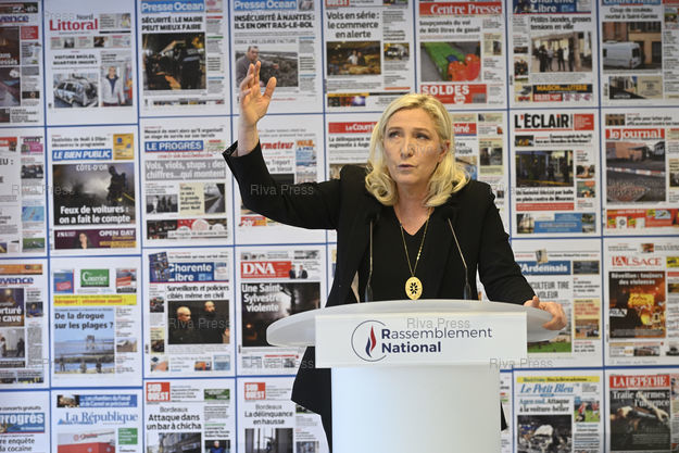 Légende : Marine Le Pen, présidente du Rassemblement National, présente son livre blanc sur la sécurité, "thème majeur" pour l'élection présidentielle de 2022. Fond garni de titres de la Presse quotidienne régionale, à laquelle Marine Le Pen rend hommage /// Marine Le Pen, President of the Rassemblement National far-right Party, presents her White Paper on security, "major theme" for the presidential election of 2022. Background filled with titles from the regional daily press, to which Marine Le Pen pays tribute - Nanterre - 26/02/2020 - Photo © Lionel Préau +33 (0)6 68 12 83 77