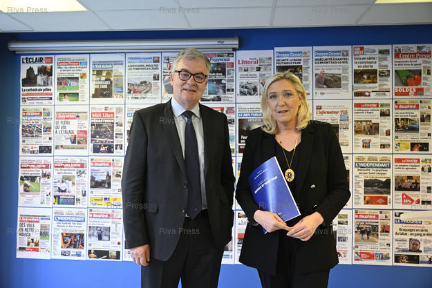 Légende : Marine Le Pen, présidente du Rassemblement National, présente son livre blanc sur la sécurité, "thème majeur" pour l'élection présidentielle de 2022. Fond garni de titres de la Presse quotidienne régionale, à laquelle Marine Le Pen rend hommage. Marine Le Pen avec Jean-Paul Garraud, député européen, auteur du livre blanc /// Marine Le Pen, President of the Rassemblement National far-right Party, presents her White Paper on security, "major theme" for the presidential election of 2022. Background filled with titles from the regional daily press, to which Marine Le Pen pays tribute. Marine Le Pen with Jean-Paul Garraud, MEP, author of the White Paper - Nanterre - 26/02/2020 - Photo © Lionel Préau +33 (0)6 68 12 83 77