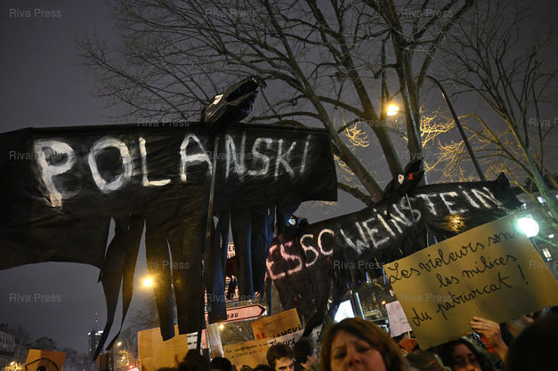 Légende : Des féministes manifestent aux abords de la salle où a eu lieu la 45e cérémonie des César pour s'opposer aux nominations reçues par Roman Polanski et l'équipe du film "J'accuse", alors que le réalisateur est visé par plusieurs accusations de viol et est toujours poursuivi par la justice américaine pour relations sexuelles illégales avec une mineure en 1977. "Polanski - Besson - Weinstein" et "Les violeurs sont les milices du patriarcat" /// Feminists protest outside the hall where the 45th Cesar ceremony took place to oppose the nominations received by Roman Polanski and the crew of the film "J'accuse", while the director is the subject of several rape charges and is still being sued in the US for illegal sex with a minor in 1977. "Polanski - Besson - Weinstein" and "The rapists are the militias of the patriarchy" - Paris - 28/02/2020 - Photo © Lionel Préau +33 (0)6 68 12 83 77