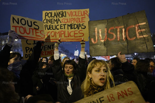 Légende : Des féministes manifestent aux abords de la salle où a eu lieu la 45e cérémonie des César pour s'opposer aux nominations reçues par Roman Polanski et l'équipe du film "J'accuse", alors que le réalisateur est visé par plusieurs accusations de viol et est toujours poursuivi par la justice américaine pour relations sexuelles illégales avec une mineure en 1977. "Polanski violeur, Cinema coupable, public et medias complices" /// Feminists protest outside the hall where the 45th Cesar ceremony took place to oppose the nominations received by Roman Polanski and the crew of the film "J'accuse", while the director is the subject of several rape charges and is still being sued in the US for illegal sex with a minor in 1977. "Rapist Polanski, Guilty Cinema, accomplices public and media" - Paris - 28/02/2020 - Photo © Lionel Préau +33 (0)6 68 12 83 77
