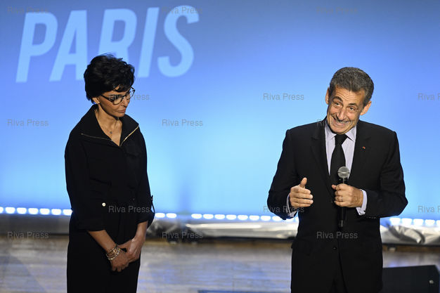 Légende : Meeting de Rachida Dati, candidate LR à la mairie de Paris, Salle Gaveau. En présence de Nicolas Sarkozy, ancien président de la république /// Meeting of Rachida Dati, LR Party candidate for mayor of Paris, Salle Gaveau. With Nicolas Sarkozy, former president of the republic - Paris - 09/03/2020 - Photo © Lionel Préau +33 (0)6 68 12 83 77