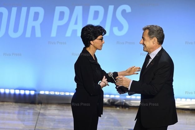 Légende : Meeting de Rachida Dati, candidate LR à la mairie de Paris, Salle Gaveau. En présence de Nicolas Sarkozy, ancien président de la république /// Meeting of Rachida Dati, LR Party candidate for mayor of Paris, Salle Gaveau. With Nicolas Sarkozy, former president of the republic - Paris - 09/03/2020 - Photo © Lionel Préau +33 (0)6 68 12 83 77