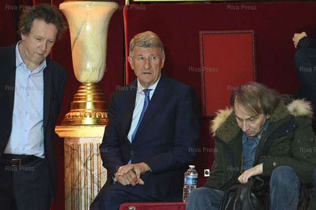 Légende : Débat "Dialogues sur l'Europe" organisé par Les Eveilleurs & Valeurs Actuelles - Cirque d'Hiver. Philippe de Villiers, fondateur du Mouvement pour la France (MPF), parti politique souverainiste, et essayiste, entre Benoit Duteurtre et Michel Houellebecq, écrivains et essayistes /// Debate "Dialogues on Europe" organized by Les Eveilleurs & Valeurs Actuelles - Cirque d'Hiver. Philippe de Villiers, founder of the Mouvement pour la France (MPF), a sovereignist political party, and essayist, between Benoit Duteurtre and Michel Houellebecq, writers and essayists - Paris - 25/04/2019 - Photo © Lionel Préau +33 (0)6 68 12 83 77