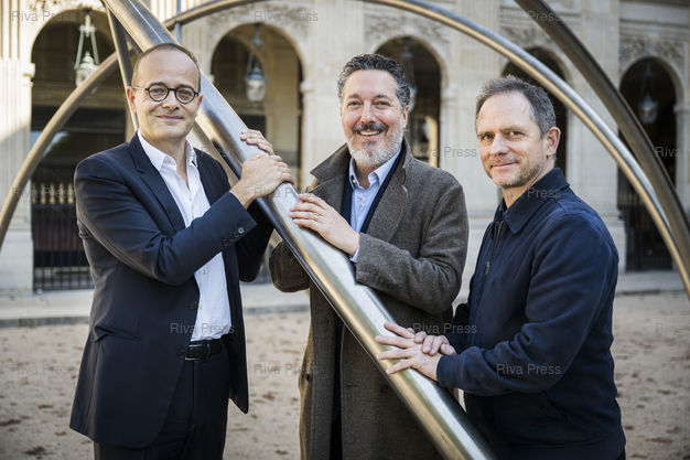Légende : Guillaume Gallienne, Mathieu Laine et Karol Beffa posent dans les jardins du Palais Royal a Paris a l'occasion de la sortie du conte musical "Le roi qui tombait amoureux" auquel ils ont tous les trois contibue. Le 02/10/2025 /// Guillaume Gallienne, Mathieu Laine and Karol Beffa pose in the gardens of the Palais Royal in Paris on the occasion of the release of the musical tale "The King Who Fell in Love" to which they all three contributed. On October 2, 2025 /// PHOTO Vincent Boisot