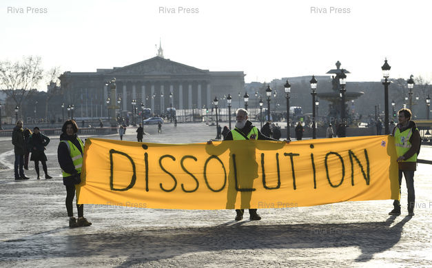 Légende : Manifestation à l'appel de la CGT, en présence de gilets jaunes, avec pour revendications : hausse des salaires, justice fiscale, opposition à la réforme du lycée, à l'augmentation des frais d'inscription des étudiants étrangers, droit de manifester, défense du service public. Banderole "Dissolution" devant l'Assemblée nationale /// Demonstration at the call of the CGT (General Confederation of Labour) trade union, in the presence of yellow vests, with demands for: increase in wages, tax justice, opposition to the reform of high school, increased registration fees for foreign students, right to demonstrate, defense of the public service. "Dissolution" banner in front of the National Assembly - Paris - 05/02/2019 - Photo © Lionel Préau +33 (0)6 68 12 83 77