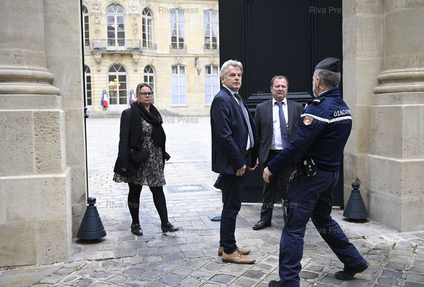 Légende : Fabien Roussel, Secrétaire national du Parti communiste français, arrive à l'hôtel de Matignon pour un entretien avec le premier ministre dans le cadre de ses ultimes consultations avec les forces politiques. En présence de Cécile Cukierman, présidente du groupe Communiste Républicain Citoyen et Écologiste - Kanaky au Sénat, et Stéphane Peu, président du groupe de la Gauche démocrate et républicaine à l'Assemblée nationale /// Fabien Roussel, National Secretary of the French Communist Party, arrives at the Hôtel de Matignon for a meeting with the Prime Minister as part of his final consultations with political forces. With Cécile Cukierman, president of the Communist Republican Citizen and Ecologist group - Kanaky in the Senate, and Stéphane Peu, president of the Democratic and Republican Left group in the National Assembly - Paris - 08/10/2025 - Photo © Lionel Préau +33 (0)6 68 12 83 77