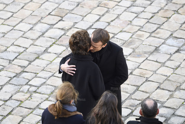 Légende : Cérémonie d'hommage national à Jean d'Ormesson, présidée par Emmanuel Macron à l'Hôtel des Invalides. Emmanuel Macron embrasse Françoise Beghin, veuve de Jean d'Ormesson /// National tribute ceremony to Jean d'Ormesson chaired by Emmanuel Macron at the Hôtel des Invalides. Emmanuel Macron and Françoise Beghin, widow of Jean d'Ormesson - Paris - 08/12/2017 - Photo © Lionel Préau +33 (0)6 68 12 83 77