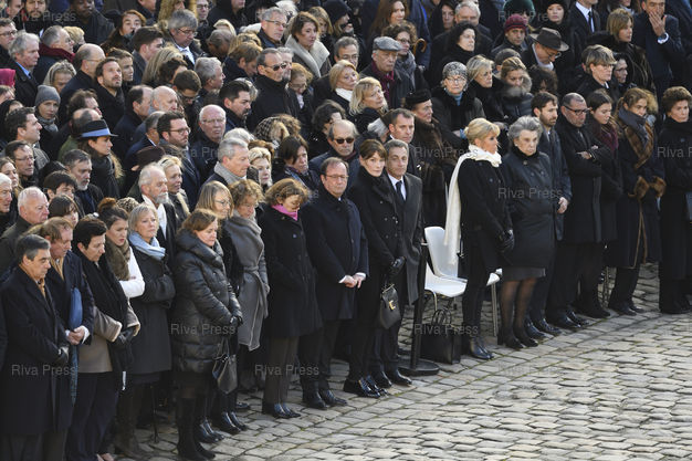 Légende : Cérémonie d'hommage national à Jean d'Ormesson, présidée par Emmanuel Macron à l'Hôtel des Invalides. En présence de François Fillon, de ministres du gouvernement, François Hollande, Carla Bruni-Sarkozy, Nicolas Sarkozy, Brigitte Macron /// National tribute ceremony to Jean d'Ormesson chaired by Emmanuel Macron at the Hôtel des Invalides. With François Fillon, Minister of the Government, François Hollande, Carla Bruni-Sarkozy, Nicolas Sarkozy, Brigitte Macron - Paris - 08/12/2017 - Photo © Lionel Préau +33 (0)6 68 12 83 77