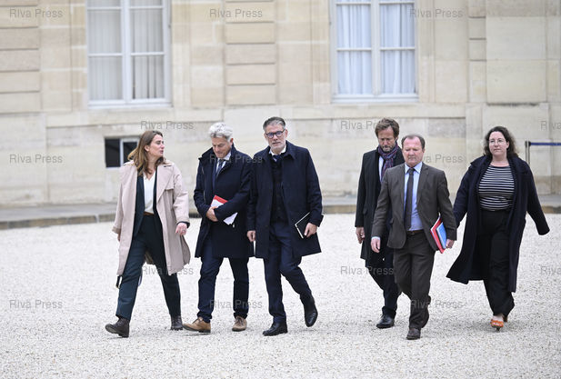 Légende : Les chefs de parti et chefs de groupe à l'Assemblée nationale, à l'exception du RN et de LFI, sont reçus par le Président de la République au palais de l'Elysée. Marine Tondelier (les Écologistes) - Fabien Roussel (PCF) - Olivier Faure (PS) - Boris Vallaud (PS) - Stéphane Peu (PCF) - Cyrielle Chatelain (les Écologistes) /// Party leaders and group leaders in the National Assembly, with the exception of the RN and LFI, are received by the President of the Republic at the Elysée Palace. Marine Tondelier (les Écologistes) - Fabien Roussel (PCF) - Olivier Faure (PS) - Boris Vallaud (PS) - Stéphane Peu (PCF) - Cyrielle Chatelain (les Écologistes) - Paris - 10/10/2025 - Photo © Lionel Préau +33 (0)6 68 12 83 77