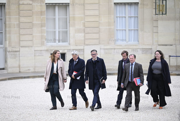 Légende : Les chefs de parti et chefs de groupe à l'Assemblée nationale, à l'exception du RN et de LFI, sont reçus par le Président de la République au palais de l'Elysée. Marine Tondelier (les Écologistes) - Fabien Roussel (PCF) - Olivier Faure (PS) - Boris Vallaud (PS) - Stéphane Peu (PCF) - Cyrielle Chatelain (les Écologistes) /// Party leaders and group leaders in the National Assembly, with the exception of the RN and LFI, are received by the President of the Republic at the Elysée Palace. Marine Tondelier (les Écologistes) - Fabien Roussel (PCF) - Olivier Faure (PS) - Boris Vallaud (PS) - Stéphane Peu (PCF) - Cyrielle Chatelain (les Écologistes) - Paris - 10/10/2025 - Photo © Lionel Préau +33 (0)6 68 12 83 77