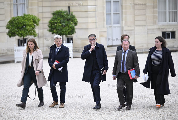 Légende : Les chefs de parti et chefs de groupe à l'Assemblée nationale, à l'exception du RN et de LFI, sont reçus par le Président de la République au palais de l'Elysée. Marine Tondelier (les Écologistes) - Fabien Roussel (PCF) - Olivier Faure (PS) - Boris Vallaud (PS) - Stéphane Peu (PCF) - Cyrielle Chatelain (les Écologistes) /// Party leaders and group leaders in the National Assembly, with the exception of the RN and LFI, are received by the President of the Republic at the Elysée Palace. Marine Tondelier (les Écologistes) - Fabien Roussel (PCF) - Olivier Faure (PS) - Boris Vallaud (PS) - Stéphane Peu (PCF) - Cyrielle Chatelain (les Écologistes) - Paris - 10/10/2025 - Photo © Lionel Préau +33 (0)6 68 12 83 77