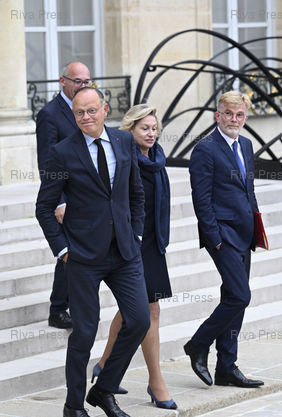 Légende : Les chefs de parti et chefs de groupe à l'Assemblée nationale, à l'exception du RN et de LFI, sont reçus par le Président de la République au palais de l'Elysée. Édouard Philippe (Horizons), Nathalie Delattre (Parti radical), Marc Fesneau (Modem) /// Party leaders and group leaders in the National Assembly, with the exception of the RN and LFI, are received by the President of the Republic at the Elysée Palace. Édouard Philippe (Horizons), Nathalie Delattre (Radical Party), Marc Fesneau (Modem) - Paris - 10/10/2025 - Photo © Lionel Préau +33 (0)6 68 12 83 77