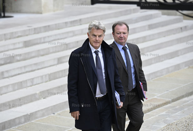 Légende : Les chefs de parti et chefs de groupe à l'Assemblée nationale, à l'exception du RN et de LFI, sont reçus par le Président de la République au palais de l'Elysée. Fabien Roussel et Stéphane Peu (PCF) /// Party leaders and group leaders in the National Assembly, with the exception of the RN and LFI, are received by the President of the Republic at the Elysée Palace. Fabien Roussel and Stéphane Peu (PCF) - Paris - 10/10/2025 - Photo © Lionel Préau +33 (0)6 68 12 83 77