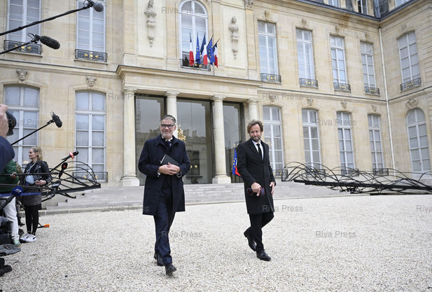 Légende : Les chefs de parti et chefs de groupe à l'Assemblée nationale, à l'exception du RN et de LFI, sont reçus par le Président de la République au palais de l'Elysée. Olivier Faure (PS) - Boris Vallaud (PS) /// Party leaders and group leaders in the National Assembly, with the exception of the RN and LFI, are received by the President of the Republic at the Elysée Palace. Olivier Faure (PS) - Boris Vallaud (PS) - Paris - 10/10/2025 - Photo © Lionel Préau +33 (0)6 68 12 83 77