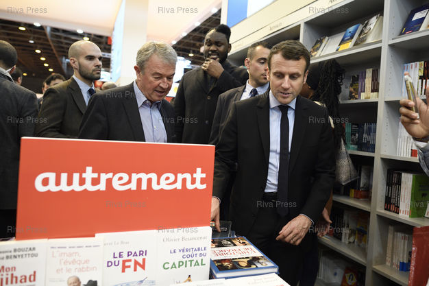 Caption : Emmanuel Macron, candidat du mouvement "En marche !" à l'élection présidentielle, visite le Salon du Livre - Porte de Versailles. En présence d'Antoine Gallimard /// Emmanuel Macron, candidate of the movement "En Marche !" to the presidential election, visite the Book Fair. With Antoine Gallimard - Porte de Versailles - Paris - 24/03/2017 - Photo © Lionel Préau +33 (0)6 68 12 83 77