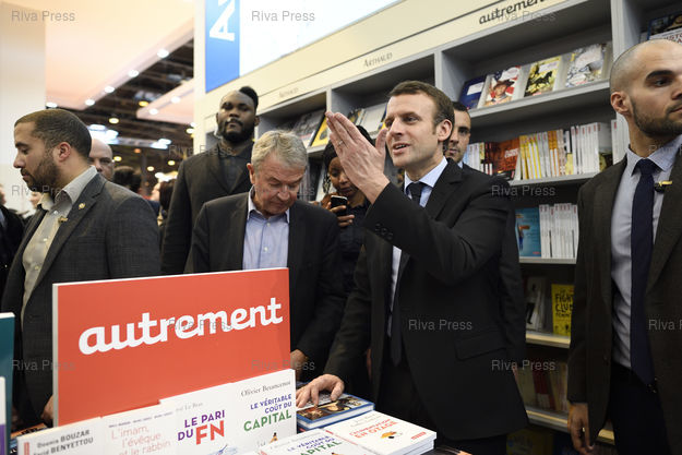 Caption : Emmanuel Macron, candidat du mouvement "En marche !" à l'élection présidentielle, visite le Salon du Livre - Porte de Versailles. En présence d'Antoine Gallimard /// Emmanuel Macron, candidate of the movement "En Marche !" to the presidential election, visite the Book Fair. With Antoine Gallimard - Porte de Versailles - Paris - 24/03/2017 - Photo © Lionel Préau +33 (0)6 68 12 83 77