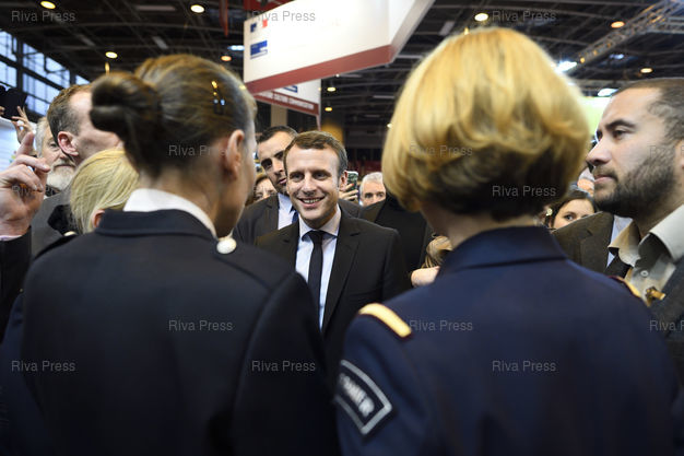 Caption : Emmanuel Macron, candidat du mouvement "En marche !" à l'élection présidentielle, visite le Salon du Livre - Porte de Versailles. Stand du ministère de la défense /// Emmanuel Macron, candidate of the movement "En Marche !" to the presidential election, visite the Book Fair - Porte de Versailles. Stand of the Ministry of Defence - Paris - 24/03/2017 - Photo © Lionel Préau +33 (0)6 68 12 83 77