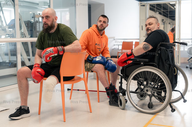 Légende : Des veterans blesses s'entrainent a la boxe au centre de reeducation Superhumans. Brandon Nicolas (au centre) est un soldat francais engage volontaire dans la legion etrangere ukrainienne. En decembre 2022, sa position est attaquee par l'armee russe et il recoit plusieurs balles dans la jambe. Après plus d'une dizaine d'operations, il reapprend a marcher au centre Superhumans. Finance par des donateurs ukrainiens et etrangers, l'etablissement est specialise dans la chirurgie reconstructive et les protheses. Le centre a deja pris en charge plus de 1000 civils et veterans blesses au cours de la guerre declenchee par la Russie en fevrier 2022. Lviv, ukraine, le 10 mai 2025. Teo Manisier / Riva-Press /// Wounded veterans train in boxing at the Superhumans rehabilitation center. Brandon Nicolas (center) is a French soldier who volunteered for the Ukrainian Foreign Legion. In December 2022, his position was attacked by the Russian army and he was shot several times in the leg. After more than a dozen operations, he is learning to walk again at the Superhumans center. Funded by Ukrainian and foreign donors, the facility specializes in reconstructive surgery and prosthetics. The center has already treated more than 1,000 civilians and veterans wounded during the war started by Russia in February 2022. Lviv, Ukraine, May 10, 2025. Teo Manisier / Riva-Press