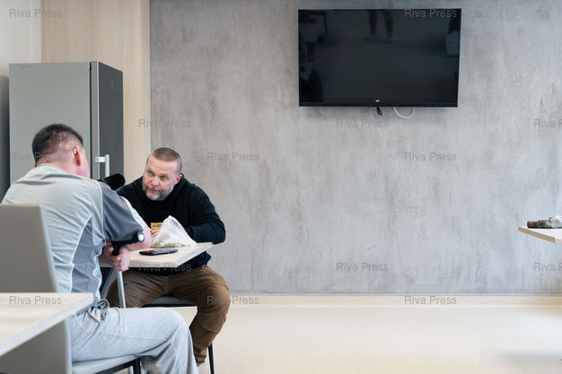 Légende : Le veteran ukrainien Serhii Velychansky pendant une seance de prise de parole avec un autre veteran blesse au combat dans la guerre declenchee par la Russie en fevrier 2022. Serhii a fonde l'association "Improv 4.5.0" pour aider les ancien soldats et les accompagner dans leur retour a la vie civile. Kiev Kyiv, Ukraine, le 6 mai 2025. Teo Manisier / Riva-Press /// Ukrainian veteran Serhii Velychansky during a conversation with another veteran wounded in combat in the war started by Russia in February 2022. Serhii founded the association "Improv 4.5.0" to help former soldiers and support them in their return to civilian life. Kyiv, Ukraine, May 6, 2025. Teo Manisier / Riva-Press