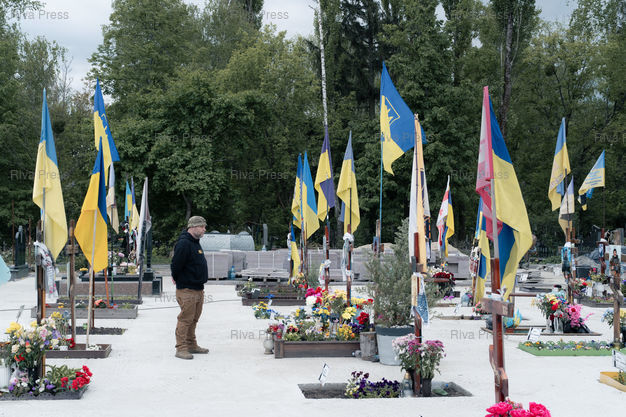 Légende : Le veteran ukrainien Serhii Velychansky visite le cimetiere de Berkovetske, ou reposent huit de ses frères d'armes, dans la banlieue de Kiev. Serhii a fonde l'association "Improv 4.5.0" pour aider les ancien soldats et les accompagner dans leur retour a la vie civile. Kiev Kyiv, Ukraine, le 6 mai 2025. Teo Manisier / Riva-Press /// Ukrainian veteran Serhii Velychansky visits the Berkovetske cemetery, where eight of his brothers in arms are buried, in the suburbs of Kiev. Serhii founded the association "Improv 4.5.0" to help former soldiers and support them in their return to civilian life. Kiev Kyiv, Ukraine, May 6, 2025. Teo Manisier / Riva-Press