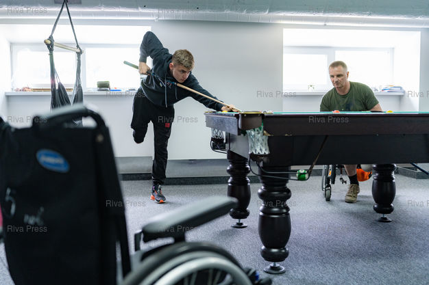 Légende : Deux veterans ukrainiens amputes jouent au billard au centre Superhumans. L'etablissement ukrainien ultramoderne et finance par des donateurs ukrainiens et etrangers est specialise dans la chirurgie reconstructive et les protheses. Le centre a deja pris en charge plus de 1000 civils et veterans blesses au cours de la guerre declenchee par la Russie en fevrier 2022. Lviv, Ukraine le 7 mai 2025. Teo Manisier / Riva-Press /// Two Ukrainian veterans with amputations play pool at the Superhumans center. The state-of-the-art Ukrainian facility, funded by Ukrainian and foreign donors, specializes in reconstructive surgery and prosthetics. The center has already treated more than 1,000 civilians and veterans wounded during the war started by Russia in February 2022. Lviv, Ukraine, May 7, 2025. Teo Manisier / Riva-Press