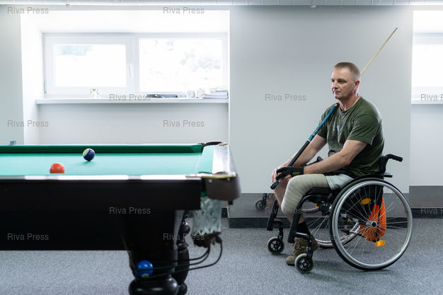 Légende : Valeri attend son tour dans la salle de jeu du centre de reeducation Superhumans, le 7 mai 2025. Le veteran se remet de son amputation en jouant au billard, qui l'aide a retrouver ses capacites motrices et sa coordination. Il a reçu un trophee lors de la "Warriors' Cup" organisee par l'Association medicale territoriale du ministere de l'Interieur, et se prepare pour des tournois internationaux. Le centre Superhumans, finance par des donateurs ukrainiens et etrangers est specialise dans la chirurgie reconstructive et les protheses. L'etablissement a deja pris en charge plus de 1000 civils et veterans blesses au cours de la guerre declenchee par la Russie en fevrier 2022. Lviv, Ukraine, le 7 mai 2025. Teo Manisier / Riva-Press /// Valeri waits his turn in the games room at the Superhumans rehabilitation center on May 7, 2025. The veteran is recovering from his amputation by playing pool, which is helping him regain his motor skills and coordination. He received a trophy at the "Warriors' Cup" organized by the Territorial Medical Association of the Ministry of Internal Affairs and is preparing for international tournaments. The Superhumans center, funded by Ukrainian and foreign donors, specializes in reconstructive surgery and prosthetics. The facility has already treated more than 1,000 civilians and veterans wounded during the war started by Russia in February 2022. Lviv, Ukraine, May 7, 2025. Teo Manisier / Riva-Press