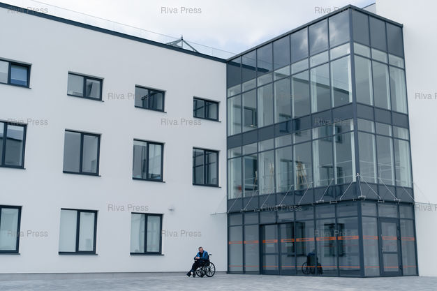 Légende : Un blesse devant le centre de reeducation Superhumans. L'etablissement ukrainien ultramoderne et finance par des donateurs ukrainiens et etrangers est specialise dans la chirurgie reconstructive et les protheses. Le centre a deja pris en charge plus de 1000 civils et veterans blesses au cours de la guerre declenchee par la Russie en fevrier 2022. Lviv, Ukraine, le 7 mai 2025. Teo Manisier / Riva-Press /// An injured person in front of the Superhumans rehabilitation center. The ultra-modern Ukrainian facility, funded by Ukrainian and foreign donors, specializes in reconstructive surgery and prosthetics. The center has already treated more than 1,000 civilians and veterans wounded during the war started by Russia in February 2022. Lviv, Ukraine, May 7, 2025. Teo Manisier / Riva-Press