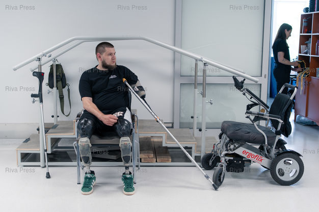 Légende : Anton Gladun lors d'une seance de reeducation au centre Superhumans. Le soldat ukrainien avait 22 ans et combattait dans la 3e brigade de l'armee ukrainienne lorsqu'une mine russe a tue son frere d'armes sur le front a Izium, debut 2022, et l'a grievement blesse. Il a perdu ses deux jambes et son bras gauche, et apprend desormais à se servir de protheses robotisees dans le centre Superhumans. Anton souhaite poursuivre ses etudes en informatique des que sa convalescence sera achevee. Finance par des donateurs ukrainiens et etrangers, l'etablissement a deja pris en charge plus de 1000 civils et veterans blesses au cours de la guerre declenchee par la Russie en fevrier 2022. Lviv, Ukraine, le 7 mai 2025. Teo Manisier / Riva-Press /// Anton Gladun during a rehabilitation session at the Superhumans center. The Ukrainian soldier was 22 years old and fighting in the Ukrainian army's 3rd Brigade when a Russian mine killed his brother in arms on the front line in Izium in early 2022 and seriously injured him. He lost both legs and his left arm, and is now learning to use robotic prostheses at the Superhumans center. Anton hopes to continue his studies in computer science once his recovery is complete. Funded by Ukrainian and foreign donors, the facility has already treated more than 1,000 civilians and veterans wounded during the war launched by Russia in February 2022. Lviv, Ukraine, May 7, 2025. Teo Manisier / Riva-Press