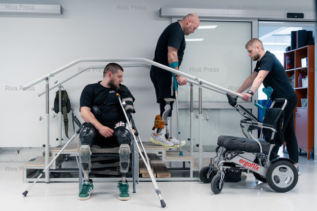 Légende : Anton Gladun (a gauche) lors d'une seance de reeducation au centre Superhumans. Le soldat ukrainien avait 22 ans et combattait dans la 3e brigade de l'armee ukrainienne lorsqu'une mine russe a tue son frere d'armes sur le front a Izium, debut 2022, et l'a grievement blesse. Il a perdu ses deux jambes et son bras gauche, et apprend desormais à se servir de protheses robotisees. Anton souhaite poursuivre ses etudes en informatique des que sa convalescence sera achevee. Finance par des donateurs ukrainiens et etrangers, l'etablissement Superhumans a deja pris en charge plus de 1000 civils et veterans blesses au cours de la guerre declenchee par la Russie en fevrier 2022. Lviv, Ukraine, le 7 mai 2025. Teo Manisier / Riva-Press /// Anton Gladun (left) during a rehabilitation session at the Superhumans center. The Ukrainian soldier was 22 years old and fighting in the Ukrainian army's 3rd Brigade when a Russian mine killed his brother in arms on the front line in Izium in early 2022 and seriously injured him. He lost both legs and his left arm, and is now learning to use robotic prostheses. Anton hopes to continue his studies in computer science once his recovery is complete. Funded by Ukrainian and foreign donors, the Superhumans facility has already treated more than 1,000 civilians and veterans wounded during the war launched by Russia in February 2022. Lviv, Ukraine, May 7, 2025. Teo Manisier / Riva-Press