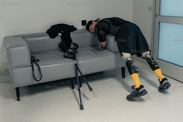 Légende : Un veteran ukrainien ampute prend une pause pendant une seance de reeducation au centre de Superhumans. L'etablissement ukrainien ultramoderne, finance par des donateurs ukrainiens et etrangers, est specialise dans la chirurgie reconstructive et les protheses. Le centre a deja pris en charge plus de 1000 civils et veterans blesses au cours de la guerre declenchee par la Russie en fevrier 2022. Lviv, Ukraine, le 8 mai 2025. Teo Manisier / Riva-Press /// An amputee Ukrainian veteran takes a break during a rehabilitation session at the Superhumans center. The state-of-the-art Ukrainian facility, funded by Ukrainian and foreign donors, specializes in reconstructive surgery and prosthetics. The center has already treated more than 1,000 civilians and veterans wounded during the war started by Russia in February 2022. Lviv, Ukraine, May 8, 2025. Teo Manisier / Riva-Press