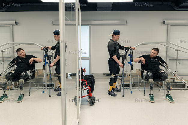 Légende : Anton Gladun (assis) fait une pause lors d'une seance de reeducation au centre Superhumans. Le soldat ukrainien avait 22 ans et combattait dans la 3e brigade de l'armee ukrainienne lorsqu'une mine russe a tue son frere d'armes sur le front a Izium, debut 2022, et l'a grievement blesse. Il a perdu ses deux jambes et son bras gauche, et apprend desormais à se servir de protheses robotisees. Anton souhaite poursuivre ses etudes en informatique des que sa convalescence sera achevee. Finance par des donateurs ukrainiens et etrangers, l'etablissement Superhumans a deja pris en charge plus de 1000 civils et veterans blesses au cours de la guerre declenchee par la Russie en fevrier 2022. Lviv, Ukraine, le 8 mai 2025. Teo Manisier / Riva-Press /// Anton Gladun (seated) takes a break during a rehabilitation session at the Superhumans center. The Ukrainian soldier was 22 years old and fighting in the Ukrainian army's 3rd Brigade when a Russian mine killed his brother in arms on the front line in Izium in early 2022 and seriously injured him. He lost both legs and his left arm, and is now learning to use robotic prostheses. Anton hopes to continue his studies in computer science once his recovery is complete. Funded by Ukrainian and foreign donors, the Superhumans facility has already treated more than 1,000 civilians and veterans wounded during the war launched by Russia in February 2022. Lviv, Ukraine, May 8, 2025. Teo Manisier / Riva-Press