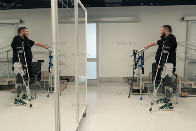 Légende : Anton Gladun fait une pause lors d'une seance de reeducation au centre Superhumans. Le soldat ukrainien avait 22 ans et combattait dans la 3e brigade de l'armee ukrainienne lorsqu'une mine russe a tue son frere d'armes sur le front a Izium, debut 2022, et l'a grievement blesse. Il a perdu ses deux jambes et son bras gauche, et apprend desormais à se servir de protheses robotisees. Anton souhaite poursuivre ses etudes en informatique des que sa convalescence sera achevee. Finance par des donateurs ukrainiens et etrangers,l'etablissement Superhumans a deja pris en charge plus de 1000 civils et veterans blesses au cours de la guerre declenchee par la Russie en fevrier 2022. Lviv, Ukraine, le 8 mai 2025. Teo Manisier / Riva-Press /// Anton Gladun takes a break during a rehabilitation session at the Superhumans center. The Ukrainian soldier was 22 years old and fighting in the Ukrainian army's 3rd Brigade when a Russian mine killed his brother in arms on the front line in Izium in early 2022 and seriously injured him. He lost both legs and his left arm, and is now learning to use robotic prostheses. Anton hopes to continue his studies in computer science once his recovery is complete. Funded by Ukrainian and foreign donors, the Superhumans facility has already treated more than 1,000 civilians and veterans wounded during the war launched by Russia in February 2022. Lviv, Ukraine, May 8, 2025. Teo Manisier / Riva-Press