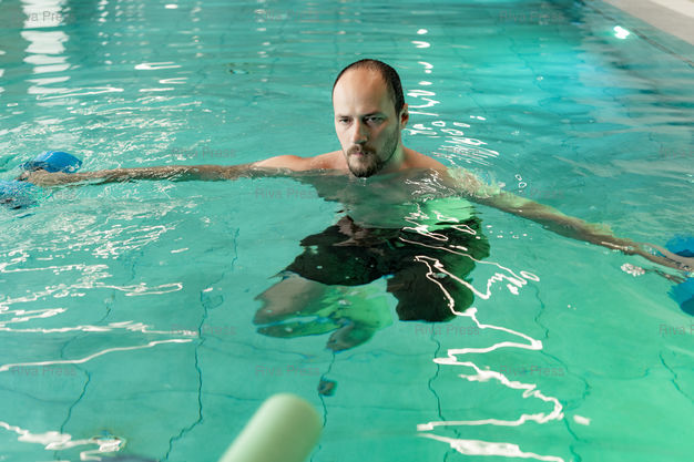Légende : Un veteran ukrainien fait des exercices de reeducation au centre Superhumans. Finance par des donateurs ukrainiens et etrangers, l'etablissement a deja pris en charge plus de 1000 civils et veterans blesses au cours de la guerre declenchee par la Russie en fevrier 2022. Lviv, Ukraine, le 9 mai 2025. Teo Manisier / Riva-Press /// A Ukrainian veteran does rehabilitation exercises at the Superhumans center. Funded by Ukrainian and foreign donors, the facility has already treated more than 1,000 civilians and veterans wounded during the war started by Russia in February 2022. Lviv, Ukraine, May 9, 2025. Teo Manisier / Riva-Press