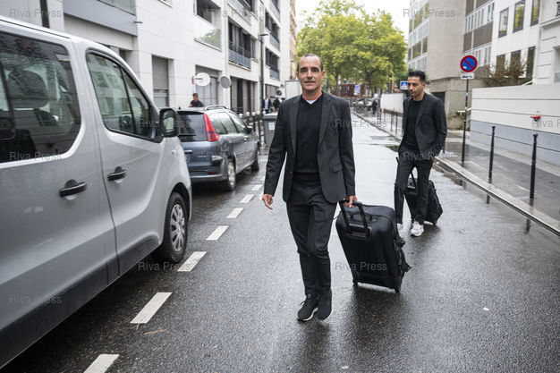 Légende : Benoit Millot, arbitre principal du match Paris FC-Lorient comptant pour la 7eme journee de Ligue 1, et le quatrieme arbitre Karim Abed quittent leur hotel pour se rendre au stade Jean Bouin ou se deroule la rencontre. A Boulogne-BIllancourt, le 03/10/2205 /// Benoit Millot, head referee for the Paris FC-Lorient match on Matchday 7 of French Ligue 1, and the fourth referee of the match Karim Abed leave their hotel to go to the Jean Bouin stadium where the match is taking place. In Boulogne-Billancourt. On October 3, 2025 /// PHOTO VIncent Boisot