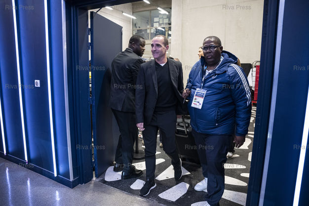 Légende : Benoit Millot, arbitre principal du match Paris FC-Lorient comptant pour la 7eme journee de Ligue 1, arrive au stade Jean Bouin ou se deroule la rencontre, accompagne par le commissaire aux arbitres du PFC Eddy Cellamen (a droite). A Paris, le 03/10/2205 /// Benoit Millot, head referee for the Paris FC-Lorient match on Matchday 7 of French Ligue 1, arrives at the Jean Bouin stadium where the match is taking place, accompanied by PFC referee commissioner Eddy Cellamen (right). In Paris. On October 3, 2025 /// PHOTO VIncent Boisot
