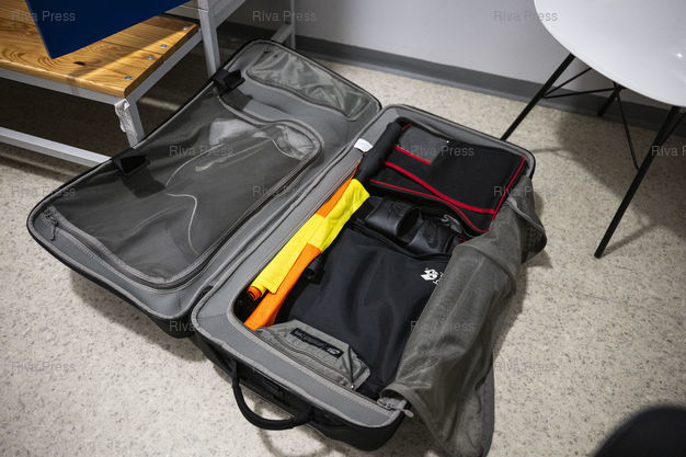 Légende : La valise de l'abritre principal Benoit Millot, dans un vestiaire du Stade Jean Bouin avant le coup d'envoi du match Paris FC-Lorient comptant pour la 7eme journee de Ligue 1. A Paris, le 03/10/2205 /// The suitcase of head coach Benoit Millot, in a locker room at the Stade Jean Bouin before kick-off of the Paris FC-Lorient match on Matchday 7 of Ligue 1. In Paris. On October 3, 2025 /// PHOTO VIncent Boisot