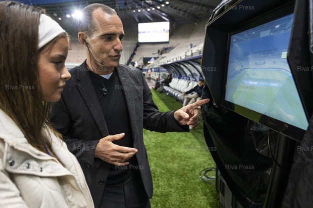 Légende : Benoit Millot, arbitre principal du match Paris FC-Lorient comptant pour la 7eme journee de Ligue 1, decouvre la pelouse du Stade Jean Bouin avant la rencontre et teste l'ecran de la VAR en bord de terrain. A ses cotes, la jeune arbitre du Val d'Oise Jihane El Bakkioui invitee a venir donner le coup d'envoi fictif dans le cadre des "Journees de l'arbitrage". A Paris, le 03/10/2205 /// discovers the pitch at the Stade Jean Bouin before the match and tests the VAR screen on the sidelines. Alongside him, young Val d'Oise referee Jihane El Bakkioui, invited to come and give the fictitious kick-off as part of the "Journées de l'arbitrage" (Refereeing Days). In Paris. On October 3, 2025 /// PHOTO VIncent Boisot